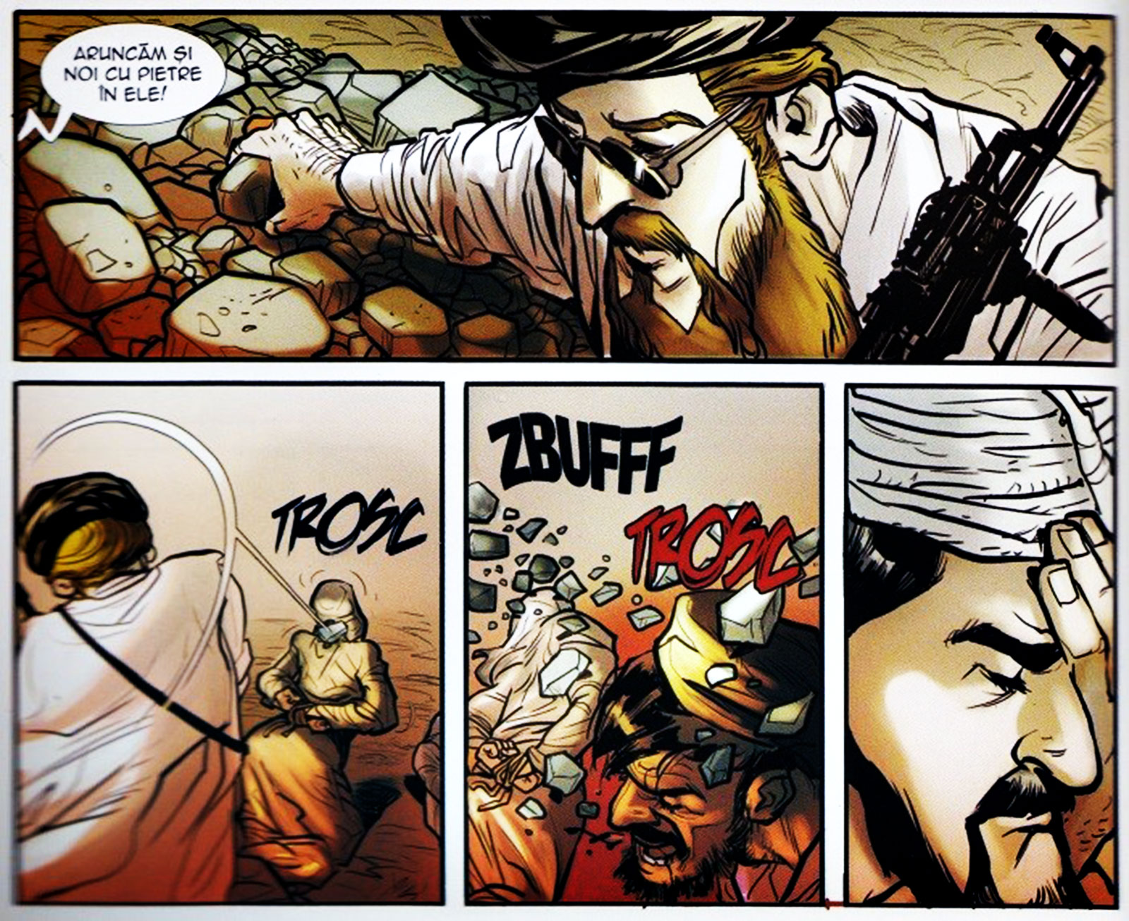 Am lăsat special la urmă cohorta de onomatopee, prezente în orice roman grafic. Aici a trebuit să (semi-)inventez, să-mi pun imaginația la contribuție și, pe alocuri, să citesc cu glas tare să mă asigur de muzicalitatea onomatopeelor. Fiecare zgomot ajunge să fie articulat în baza unui design sonor îndelung exersat de autorii de romane grafice: