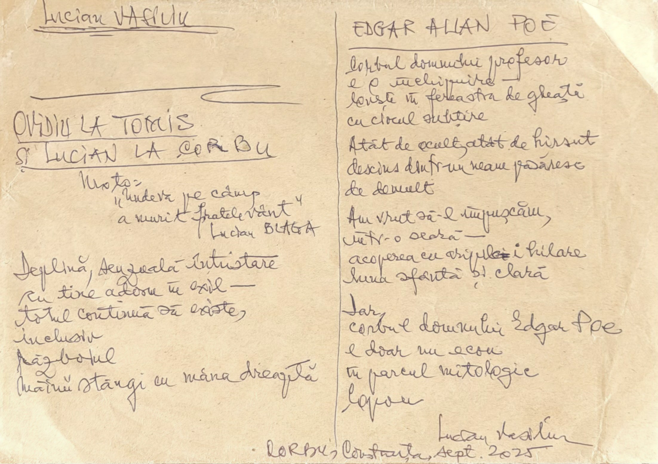 Von den schwungvollen Wellen des Schwarzen Meeres in Corbu und Constanța, Rumänien angefeuert hat mir der rumänische Dichter Lucian Vasiliu diese zwei Gedichte anvertraut, die er während des Festivals Gedicht im Sand – das mit Anmut von Daniela Varvara und Iulia Pană an der Schwarzmeerküste organisert wurde – Ende des vorigen Sommers geschrieben hat. (Peter Sragher)