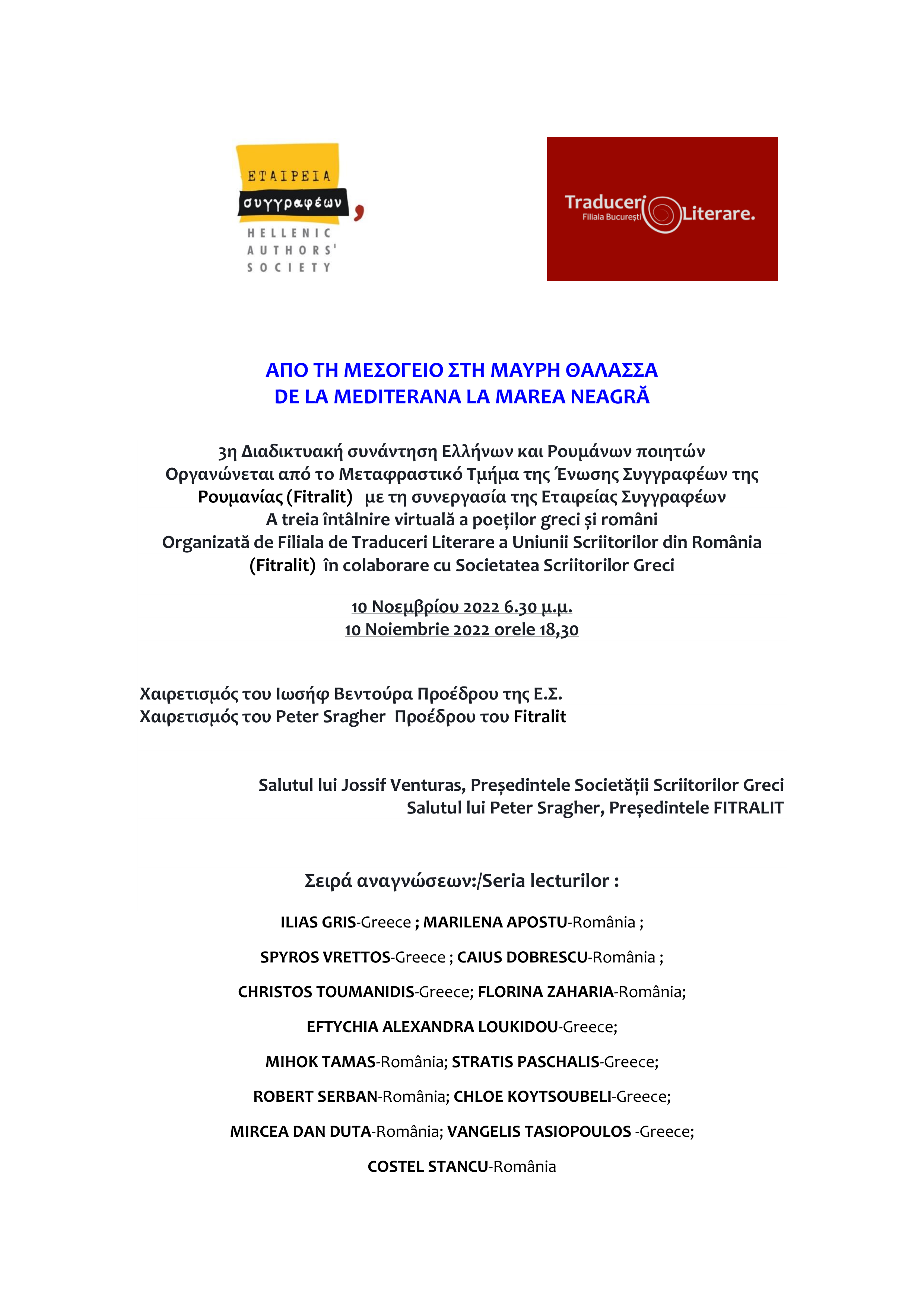 Ca de obicei, din partea română au fost poeți și poete ai Uniunii Scriitorilor din România (USR), dar și doi poeți a căror poezie o apreciem în mod aparte și nu sunt membri ai USR. Ei merită cu prisosință să fie cunoscuți de poeții și poetele din Grecia, de toți care au urmărit întâlnirea noastră virtuală și sunt iubitori de poezie, dar și de cei care vor să vadă acum întâlnirea poetică, odată ce o facem accesibilă oricui.