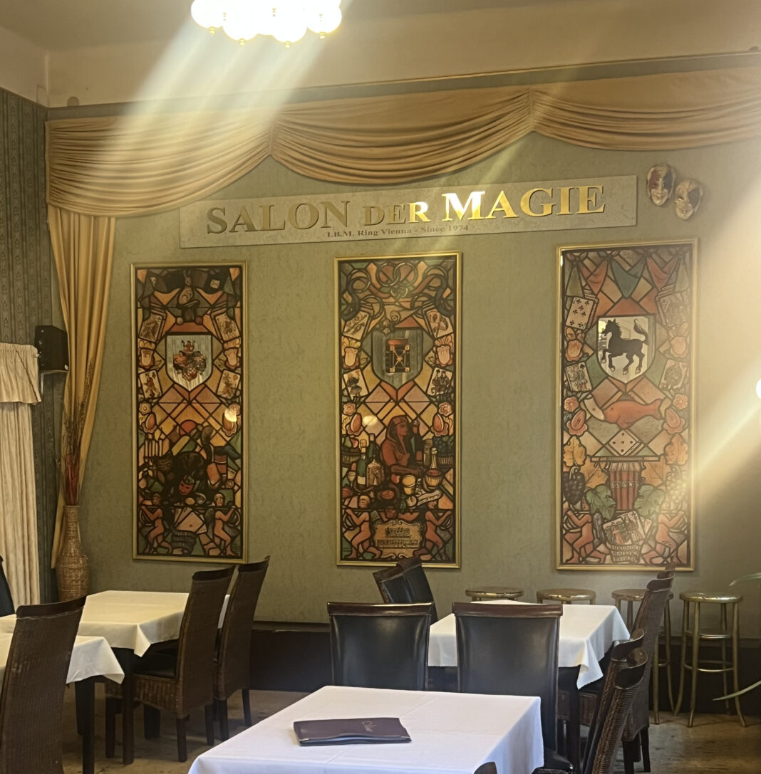 Deodată văd că în afara saloanelor obișnuite mai e o ușă care uneori se închide, dar oricând se poate deschide, unde ne întâmpină Salon der Magie (Salonul Magiei). Nu, nu suntem în Alice în Țara Minunilor care, oricum, a avut premiera la Viena luna aceasta, nu suntem în mijlocul unui film cu Harry Potter sau alături de Aladin și lampa fermecată, nici în prezența glasului fermecător al Șeherezadei care noapte de noapte istorisea câte o poveste nemaiauzită regelui Șahriar, ca să scape cu viață de furia lui împotriva tuturor femeilor (căci femeia lui îi fusese infidelă), nu, nu suntem în țările în care viața este un mister care apare ceas de ceas, zi de zi. Astăzi este însă o zi cu totul specială în Salonul Magiei, înțesat cu afișele marilor magicieni, de la Lance Burton la Houdini. În seara aceasta de joi, 13 noiembrie 2025 va sosi Vrăjitorul și va răspândi pe nesimțite, pe nevăzute, pe neobservate întreaga lui vrajă în cafenea, seară în care oricând apa se poate preface în vin ales, iar cafeaua de orice fel se transformă într-o torță care ne transportă sufletul până în ziua binecuvântată a Crăciunului.