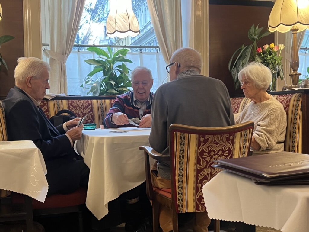 Și cum am aflat asta, pe la prânz, când continuam să-mi fac veacul în Café Zartl, o doamnă cu părul alb se apropie întâi de un domn și vorbește în germană, la care domnul îi spune că nu înțelege limba. Era un străin venit la cafenea. Așa că mă vede pe mine la masă doamna. Pare foarte abătută și ține în mână un carnețel. Îmi spune că nu mai rezistă, la ora 14.00 fix trebuia să vină cineva pe care îl așteaptă și nu a sosit. Erau de acum orele 14.05 și doamna nu știa dacă va mai sosi acea persoană – punctualitatea austriacă își spunea aici cu tărie cuvântul ! – și dacă aș fi așa de amabil să formez pe telefonul meu mobil numărul de telefon din carnețelul dumneaei. Mă declar amabil, și nu apuc bine să formez câteva cifre pe telefonul meu mobil că apare un domn, tot cu părul alb, pe care doamna îl recunoaște imediat, iar în clipa următoare îl apostrofează, spunându-i că tocmai via să plece, fiindcă el n-a sosit la timp. Trecuseră doar cinci minute, și era clar că doamna se simțea jignită că trebuie să aștepte – o doamnă nu trebuie niciodată lăsată să aștepte ! –, ce să mai vorbim de faptul că dumneaei nu auzise din îndepărtata Franță de sfertul de oră academic sau dacă auzise nu accepta această regulă de laissez-faire de pe malurile Senei. Da, și am înțeles de ce, era vorba de partenerul ei de tarot, care este un joc care nu se bazează pe întâmplare, nici pe ghicit, ci pe gândire în doi. La scurt timp au apărut și ceilalți doi parteneri de joc, iar doamnei cu părul alb părea să-i fi dispărut întreaga supărare. Jocul putea să începe.