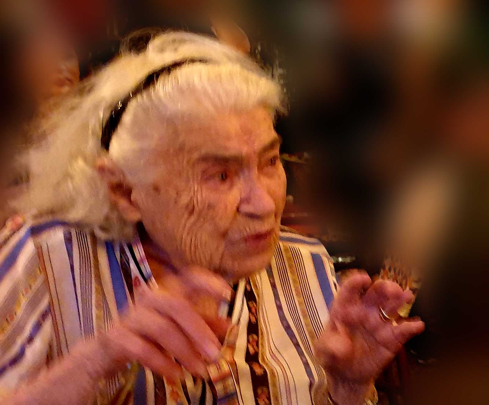 Elena Andrei, râzând cu gura până la urechi în localul ”Fattoush” din Haifa la 100 de ani (2016) – foto Peter Sragher