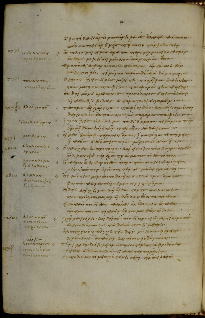 Antologia Palatină, pagina 101 din fondul de manuscrise ale Bibliotecii Universității din Heidelberg, Wikipedia Commons.