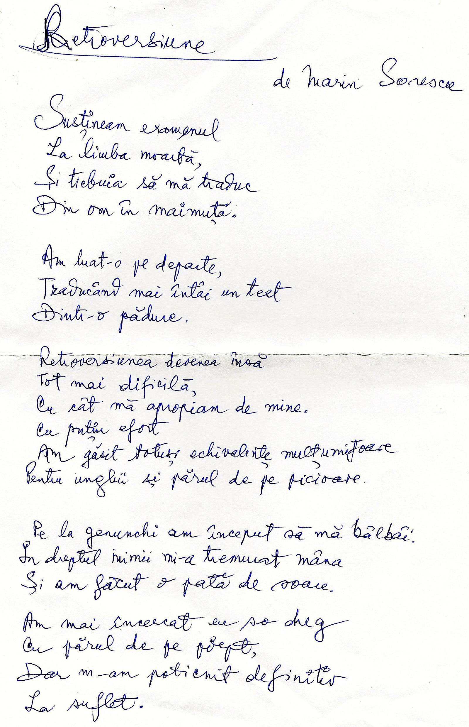 Mi-l şi închipui pe Marin Sorescu uitându-se prelung la limba latină ale cărei sunete nu îi erau perfect familiare şi meditând asupra felului în care un om vorbitor al unei limbi vii se poate apropia de-o limbă moartă. Știa latină, dar i se părea, totuși, ciudat, oricât de mult este româna îndatorată latinei, să lucreze în gol, iar pe deasupra să mai și traducă din română în latină, ca să-și probeze o presupusă excelență postadolescentină.