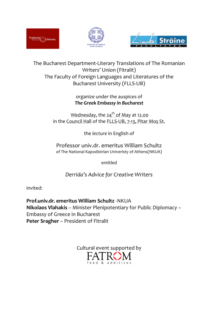 It was a real pleasure, a delight to listen to this lecture at the Council Hall of the Faculty of Foreign Languages and Literatures of The Bucharest University about a philosopher and intellectual that has triggered off as many appreciations as rebukes, so to say you either love or hate his theory od deconstructivism that has taken hold foremost in many American universities in the seventies of the former century – when also William R. Schultz listened as a student to a couple of the Frenchman’s lectures and was convinced of the truth in them. It had as a consequence a lifelong interest in the endeavors of Jacques Derrida. Professor Schultz has put together the most comprehensive bibliography of Derrida’s works and is one of the most staunch defenders of his theories. The discussions after the lecture were vivid, as was the introduction by one of the co-organizers of the event, Nikos Vlahakis, a diplomat at The Greek Embassy in Bucharest and also a poet with studies in philosophy, but also a good knowledge of the French philosopher’s deconstructivism. Furthermore, the short but condensed introductive contribution of Bogdan Ghiu, an accomplished translator and theoretician of literary translation and a great admirer of Jacques Derrida augmented the discussion that was to start. We show here the video of the lecture and discussions on that beautiful day in May 2023. (Peter Sragher)